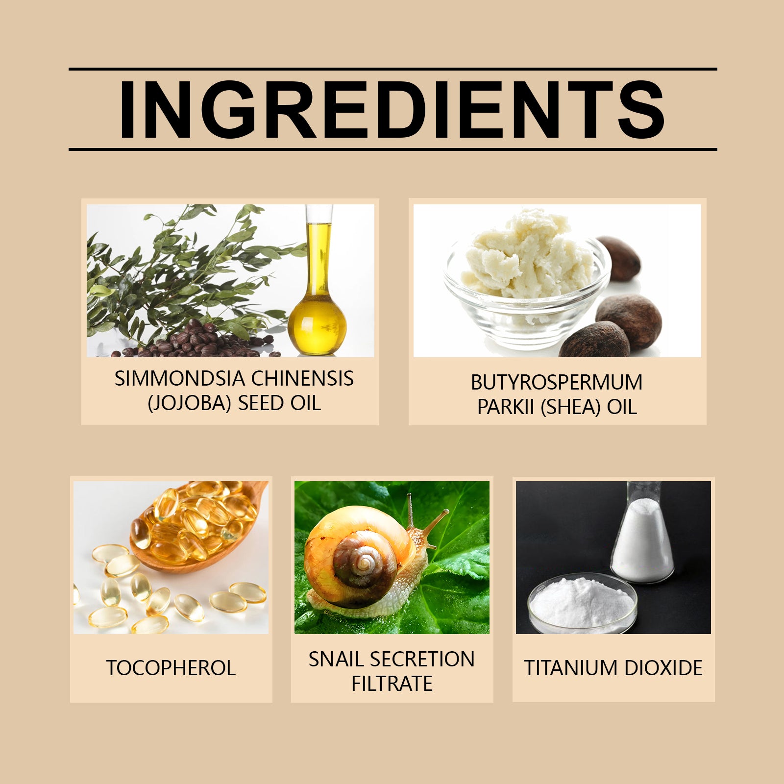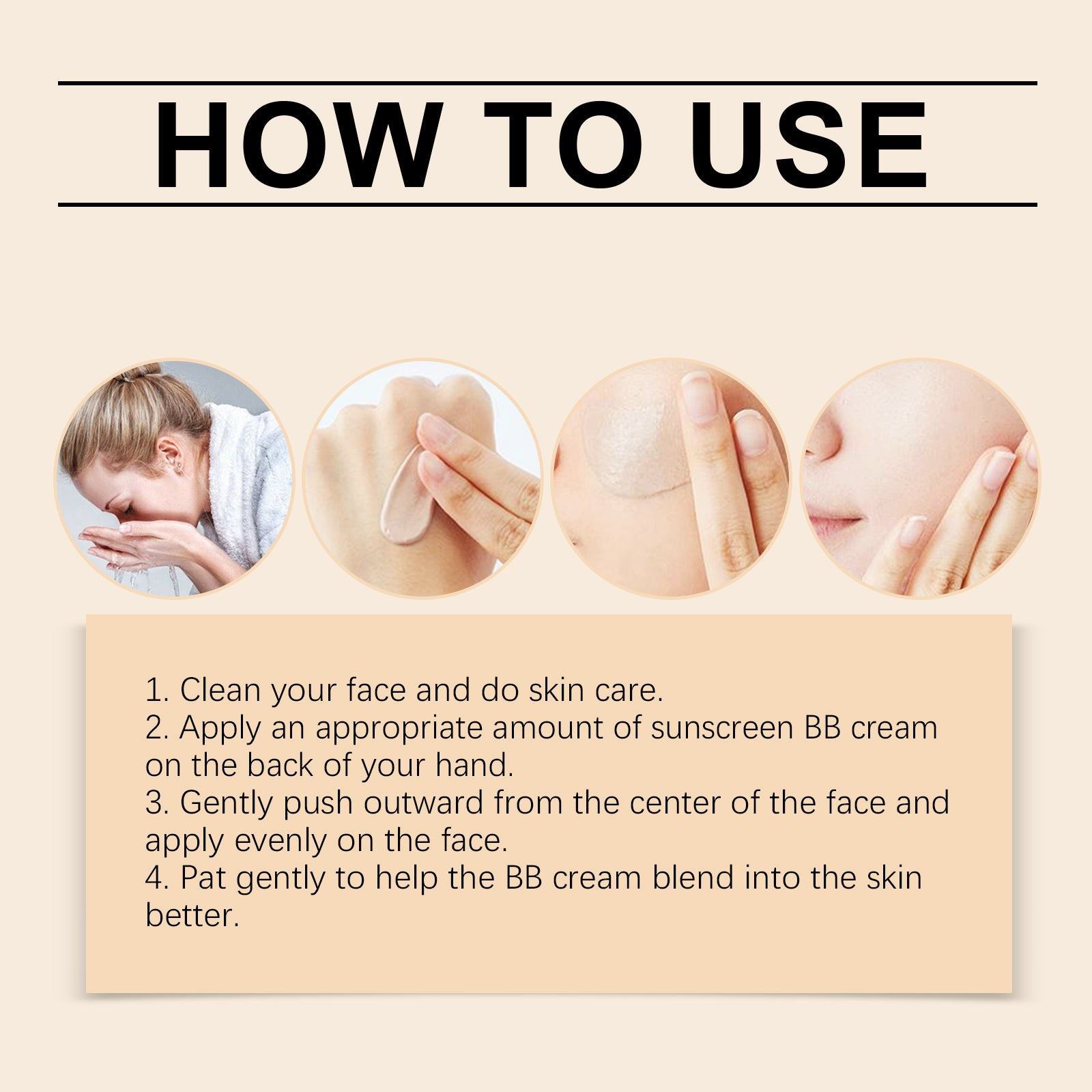 Our gold snail protective BB cream contains titanium dioxide and vitamin E. It offers comprehensive UVA and UVB protection, helping to shield the skin from the damage caused by ultraviolet rays, preventing sunburn and photoaging. The application method is very simple: 1. Clean your face and perform skin care. 2. Apply an appropriate amount of the sunscreen BB cream evenly on the back of your hand. 3. Gently push it outward from the center of your face and then evenly spread it over your face. 4. Gently pat and massage to make the BB cream better blend with your skin. And it can effectively hide skin blemishes, even out the skin tone, and significantly improve the skin texture.